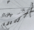 no signal continued our course. Saturday June 27th: Made all possible sail and stood in for the point on which the Challenger was lost. Saw nothing of the wreck; bore up and stood along the land one or two miles off shore in search of the river Lebu. At 5 pm, not seeing anything of the Challenger, hauled off and hove-to. At 6pm fired a rocket; no answer of any description being made, stood off. Sunday June 28th: Strong winds from north-west with heavy rain; shortened sail to foresail and headed to westward. 10.30. saw the island of Mocha, south ten miles distant and carried all possible sail to get out of the bight. Monday June 29th: At 2.30 while four men were aloft bending the fore topsail, which had been split the previous night, the vessel gave a very heavy pitch, which sprung the fore mast, a little below the cross-trees; and on her recovering herself, the head of the mast snapped short off, a foot below the fore-yard, bringing with it all above and also the four seamen who were aloft. The main-mast, having no support left from the tryatic stay, and the deck-stay being aft, ready for tacking, the great weight of the main-boom added to the pressure of the wind on the main-sail, brought the main-mast by the board, fore and aft the deck, striking the taff-rail in its fall which again carried it away, leaving the head of the mast hanging by its rigging over the stern, striking heavily against the rudder and the middle-piece in midships on the deck. Fortunately, none of the seamen was seriously injured, as they resolutely kept their hold of the topsail-yard, and were carried with it into the sea, out of which they soon escaped by means of the rigging that was hanging over the side. Every effort was immediately used to clear the wreck, and get the temporary rigging up, to secure the stump of the mainmast which had carried away the wedges in the partners, and had about three inches play in the step, from the heel of the mast being decayed, nearly the whole of the standing rigging was lost. It was necessary to get the wreck clear of the vessel lest it should carry away the rudder, and otherwise damage the hull of the vessel. Not having an axe, or anything but a cooper's draw-knife, that would cut the rigging in the eyes, |