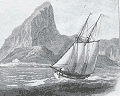 there several years before, we were obliged to haul it up taut and cut on the rail, thereby rendering it useless for anything but junk. There were scarcely any nails on board the vessel; and it was with the greatest difficulty we succeeded, by shifting two cleats up a slippery mast, in getting a tackle each side of the shrouds, and a hawser for a stay. At about midnight we set the jib, peak of foresail, and Beagle's boat sail for a main-sail. During all this time it was blowing fresh from the north-west, with heavy rain and a cross sea, which caused the vessel to roll her gunwale under each time. Everyone was quite exhausted, particularly those men who had been hanging on the mast, getting the tackles secured, the watch was therefore set until daylight. Tuesday June 30th: Employed getting the foremast better secured, by raising sheers with fore-yard and jib-boom, and placing a pair of shrouds, about 20 feet from the deck, and an extra stay to set a stay-sail on, the whole kept up by a few spikes drawn out of the beams. At 10am saw the north-west extreme of Mocha three miles distant; wore to the north-east to give more time to get more sail on the vessel, intending to weather the island if possible. Noon; wore strong winds and squally with a heavy sea. At 2pm set foresail and double reefed. At 3pm, when the north-west extreme bore north-east, the wind changed suddenly to south-west, bringing the rocks off the south west of the island about four points on the lee-bow. But the wind increasing and giving the vessel more way, enabled her to pass about three-quarters of a mile to windward of the outer breaker, on which the sea was breaking furiously. The island itself was only visible at intervals, owing to the thickness of the weather and constant heavy rain. Friday July 3rd: Repaired the Beagle's boat, which had been badly stove by the fall of the masts. Fitted gummets for sweeps in case of a calm and being drifted near the land. Sunday July 5th. Light winds from the north-west, and fine, clear weather; employed repairing sails, chafes etc. At 1pm observed the island of Mocha about twenty miles away. Monday July 6th. Strong breezes from south-south-east. At 11am saw HMS Blonde coming down to us. At 1.pm we were taken in tow and carried into Talcahuano Harbour, at the south west corner of the Bay of Conception. At midnight we anchored. |