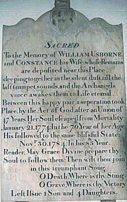 railway and the house is now surrounded by suburban development. The Loddenden connection with the Usborne family dates back to William Usbarn, (the borsholder) in the reign of Edward III (1312 - 1377). The proven pedigree starts with Osbert Usborne (or Osborne) born in 1405. He also used the name Osbertus de Hengherst. Although Loddenden is in the Usborne triangle bounded by Maidstone, Goudhurst and Staplehurst, there is no proof of blood relationship between the Loddenden Usbornes and our tribe. The estate was built up by judicious marriages, particularly when adjacent land-owning families came together with the marriage of William Usborne and Constance Toke in the 1720's. William's younger brother Edward (1705-1765) was the most prominent and successful of the family. He made his fortune in the City of London as a goldsmith and banker, dividing his time between his house in Ludgate Hill and Loddenden. Between 1732 and 1737 he bought out his brothers' share of Loddenden. The Leeds coat of arms is displayed on his tomb under the altar in Staplehurst Church. In his will (proved in 1765) his substantial fortune is divided between his wife, Mary, and relations. In addition to a life interest in his numerous properties, Mary gets £3,000 stock in New South Seas Annuities as well as his post chariot and horses, plate, jewels, china and farm stock. An entry in the Staplehurst parish register reads "Edward Usborne, Esq., in his lifetime gave a new silver flagon and patten and repaired the old cup, at the expense of twenty three pounds and wainscoated the chancel, gave a new altarpiece, communion table and rails for the table and cushions round ye rails at the expense of seventy six pounds and upwards". The last resident in direct Usborne line was Elizabeth Usborne who died in 1839, aged 95. Edward, her brother, had married a lady called Downing who was 36 years his junior and who survived him 47 years, dying in 1875. The estate then passed to her niece (who she had adopted) Elizabeth Sarah Downing, the daughter of a brother living in Australia. This lady married Major Thomas Starling Usborne (who comes from our tribe). The initials "TEU 1875" on the stable are those of Thomas and Elizabeth Usborne. Thomas Starling died in 1903 and his wife in 1906. Loddenden passed to his niece, Mrs Shaw, who divided the estate and sold it in 1908. Thus was finally broken the last link with a family which had lived at Loddenden since the days of Edward III. and owned it, at any rate, since the middle of the fifteenth century. The present owner, Jane