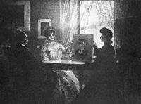 An image of Iola, spirit guide of Vice-Admiral Usborne Moore was produced by precipitation on January 22nd 1909 through the mediumship of May and Elizabeth Bangs, who sat under test conditions. The Admiral faced the canvas between them during the process at close range. When the portrait was finished the whole picture turned one hundred and eighty degrees so that the profile of the face, faced the opposite way. It was presented to the temple by Mrs Usborne Moore. William records "Two thin canvasses were stretched on wooden frames and covered with thin paper and were placed face to face and held up to the window. The blind was drawn to the top of the canvasses and curtains hung up in my presence on either side. The window has a southern aspect, and the light coming in through the two semi-transparent canvasses is sufficient for the purposes of taking notes and seeing everything that goes on. The small oak table was lengthways in the window; the bottom of the canvasses rests upon it. May Bangs sat on my right side, facing me, and pinching together her right hand one side of the canvasses; Lizzie Bangs on my left side, facing me and pinching together the other side of the canvasses with her left hand. I faced the middle of the canvasses, my nose being between two feet and two feet six inches from them. After a few minutes the canvas assumed various hues, rosy, blue and brown; it would become dark and light independently of the sun being clouded or not. On the morning of the 20th January 1909 I went to the Bang sisters for a profile portrait of Iola as arranged on the 18th. Everything was ready at 10.50am and we sat until 11.30am. I had in my pocket a carte-de-visite of Iola taken in the year 1874. The mediums had never seen this or any other photograph in my possession. Fifteen minutes after we sat in the window the face and bust appeared; the portrait was looking to the right, precisely the same aspect as it has now, framed, hanging in my room. Remember, I was looking through the back of the picture, and it was forming on the further side of that one of the two canvasses nearer to me; consequently, had it gone on as it was and been finished, it would now (when framed) be profile left. When the portrait was nearly finished the two canvasses were lowered towards me on to the table. A telegraphic came by taps to May Bangs, who said: "she wants this picture for your wife especially, as well as for you. She thinks that your wife would prefer to see her in the pose to which she is accustomed". Up went the canvasses again to the window, and I found that the whole picture was changed round, so that the profile looked to the left instead of the right. In a few minutes the portrait was completed, May Bangs remarking "she says she cannot put in the hand". From the time the face and bust first appeared to the time the canvasses were separated and the finished picture put on the sofa in the next room, twenty five minutes had elapsed". |