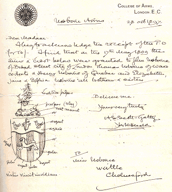 Notes written by Major Thomas Masters Usborne (1866-1952) around 1930. The construction of a 'Family Tree' which has practically no cohesion - by which I mean that a few odd near relations of the same name know one another and their more distant cousins and ancestors, but are not connected up - is a matter of some difficulty, much patience and no little expense! If each branch had its own 'caretaker', and if each of these reported casualties as they occurred, to the 'head keeper', the keeping up of the whole tree would be comparatively simple. But, if the head keeper has to watch for all casualties, it is not reasonable to think he can be up to date, or even correct in such entries that he has made. Where the name is a (so called) common one, I venture to think it would be the work of a person bordering on lunacy who attempted to start a Tree, but with an uncommon name, the job is comparatively easy, and so much more interesting, as whenever the name occurs, it may be 'one of us', and most probably is. Whatever the name, it is quite impossible to get all the members of a family dating back to times when writing (and reading) was a profession, and very few people took the trouble to learn to spell! Old Wills - from which the best evidence is obtainable, as they are official - were written in 'early English' character, and a great many of them in Latin. To attempt to get surnames and place names correctly written, and afterwards correctly re-translated, was evidently the reason of the confusion of names. I have seen our name spelt in more than a dozen different ways, and who can say that Husborne is or is not related to Usban, Osbourne, etc. Some assistance in putting together mis-spelt surnames is obtainable from lands passed on from one generation to another; in the same document the name is sometimes spelt in more than two different ways. Until I had seen for myself the awful conundrums presented by trying to decipher some of these ancient documents, I thought it possible to keep the names separate; having seen them, I am bound to change my opinions on that subject. There are officials and others who make a study of it, and charge a small fee to decipher these documents. There have been many (male) Usbornes in former times and it seems extraordinary that the name is now almost extinct; but while it is alive, it may of course continue and perhaps increase. The last branch to become extinct - at least, so I believe - was Thomas Starling (1834-1903) to whom Loddenden (at Staplehurst) - the old family mansion - descended. His wife died 3 years after him. It will be observed, by referring to the Tree, that the descendants of Alexander (1691-1737) are the only ones we know of, and many of them have become extinct. (This was written in 1922 - see below for correction TMU ). It seems impossible to connect the (so called) Staplehurst branch with ours, but perhaps it may be done by some keen descendant at some future time. It appears to 'join up' earlier than the dates we have at present (1922); I may find it, but I don't think so. That tree, though well cared for as regards eldest sons, seems to have ignored the younger members of families, but I cannot find among the latter any connecting link to our branch. (or any other branches tree). From the evidence of Wills and other documents, it appears that Kent was the home of the ancestors. There was a strong detachment round about Hertford between 1760-1840, and a smaller one about Lindfield (Sussex) and Brighton (Sussex) towards the commencement of 1700 for a short time; there were of course stragglers in other places. But during the last 100 or so years there has been an American 'invasion', which has flourished as I am sure that anyone will find who takes on this job after me! I have myself met Usbornes there, but before I began this; and they have escaped me. The senior living branch is headed by John (b 1842) of Honolulu, who has three grandsons (born 1910, 11 & 13) and the family name may thrive in the other hemisphere as much as or more than in this. It seems very curious that of all the married males to carry on the name, besides the Honolulu branch just mentioned, at the moment (Christmas 1922) the descendants of Thomas (1769-1836) - who number seven males, born between 1907 & 1920 - are the only male survivors, of the younger generation. I cannot say by whom the 'Tree' was brought to its present condition: viz. till I took it over in 1921. From the attached photos & drawings it will be observed that someone took an interest in his own branch, and where is the beautiful tablet (?) from which the photograph is taken? I think it necessary to put 'pen & paper' the information afforded by these photographs, as time & usage will gradually make them more and more indistinct. Taken from photograph of fly leaf in Loddenden prayerbook. (Where is the original?) ' In family of the Usborne's of Loddenden in Staplehurst in the County of Kent, of late years known more by the .....????? Osbert Osborne born in 1405.... John Osborne his son in 1430..... Thos Osborne his son 1480 Died 1534. Thos Osborne his son in 1520 do 1588. Thos Usborne his son in 1551 do 1611. Thos Usborne his son in 1581 do 1666. Thos Usborne his son in 1614 do 1674. NB the above had 3 sons & one daughter who married Mr Cole of Hedcorne. Thos Usborne died a bachelr. Will.m Usborne Bor, 1667 Died 1724 Edw Usborne Died a Bachelr. The above Wllm. Usborne married Han Toke eldest daughter of John & *** Toke of Marden had 4 sons & 2 daughters, viz Thos, Elizh, Willm, Elizh, Edwd, and John John Usborne married Mary Daughter of Richd & Eliz Lambert of Fleet Street, had 3 chidn liv. to be men & wo Eliz born Nov 9 1744 Chambers do Nov 22 1753 Edwd do Aug 30 1757. ' In later days, I know that John (b.1842) George (b.1845) & Thomas Starling (1834-1903) all worked on the pedigree & kept it alive, as I had some correspondence & many documents from them. But it is known Mr Everett (died in 1924) was