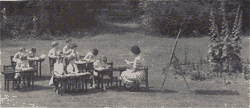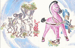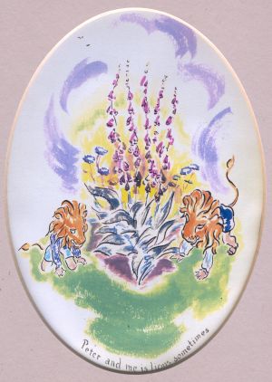 ![]() In 1944 Miss Barry's kindergarten took a direct hit by a German bomb. It was re-located to Peter and Julian's house where, on sunny days, lessons where out-doors ![]() Julian's favourite toys, Pink Horsie, Dicker and One-eyed Monkey, prepared for war with guns and helmets at the ready |